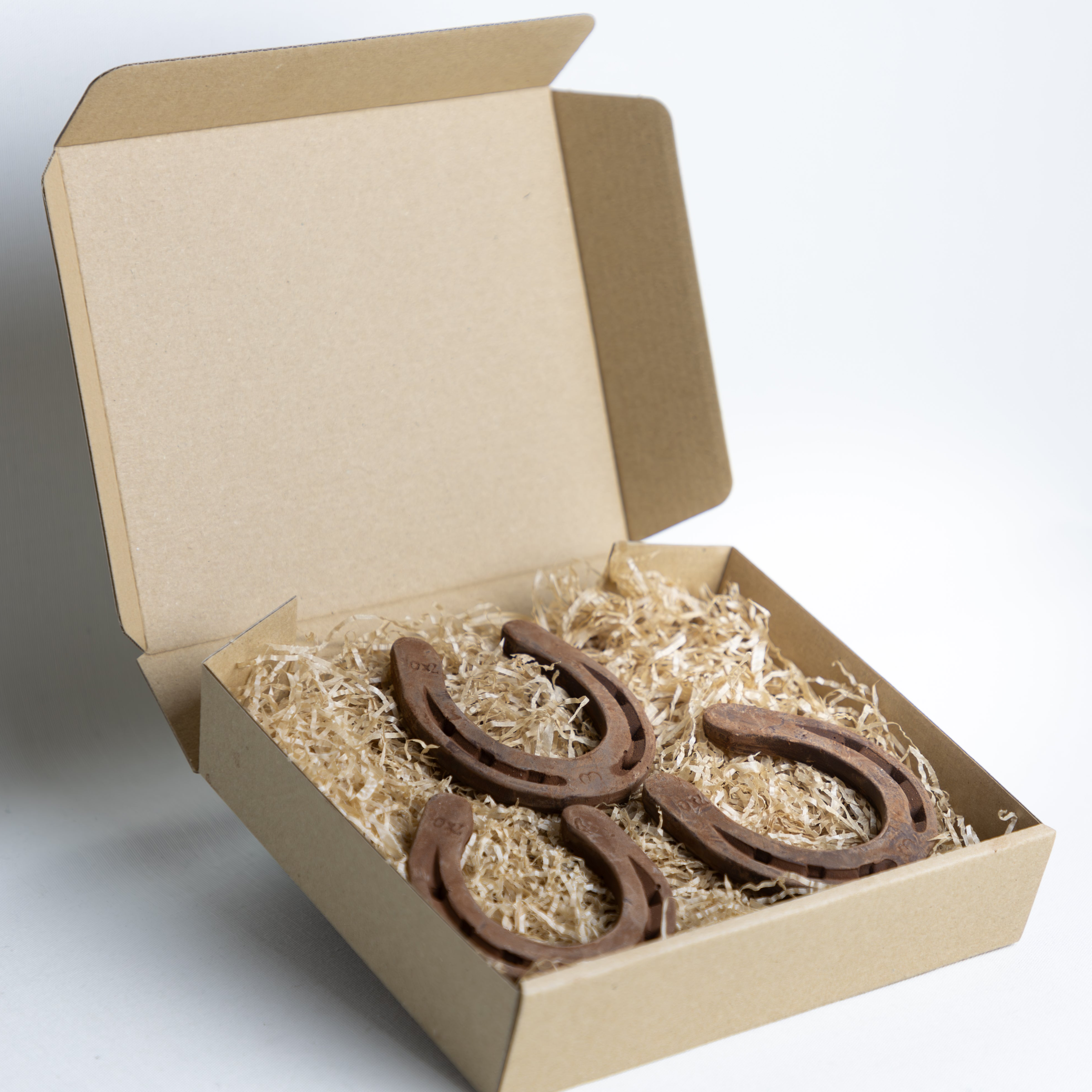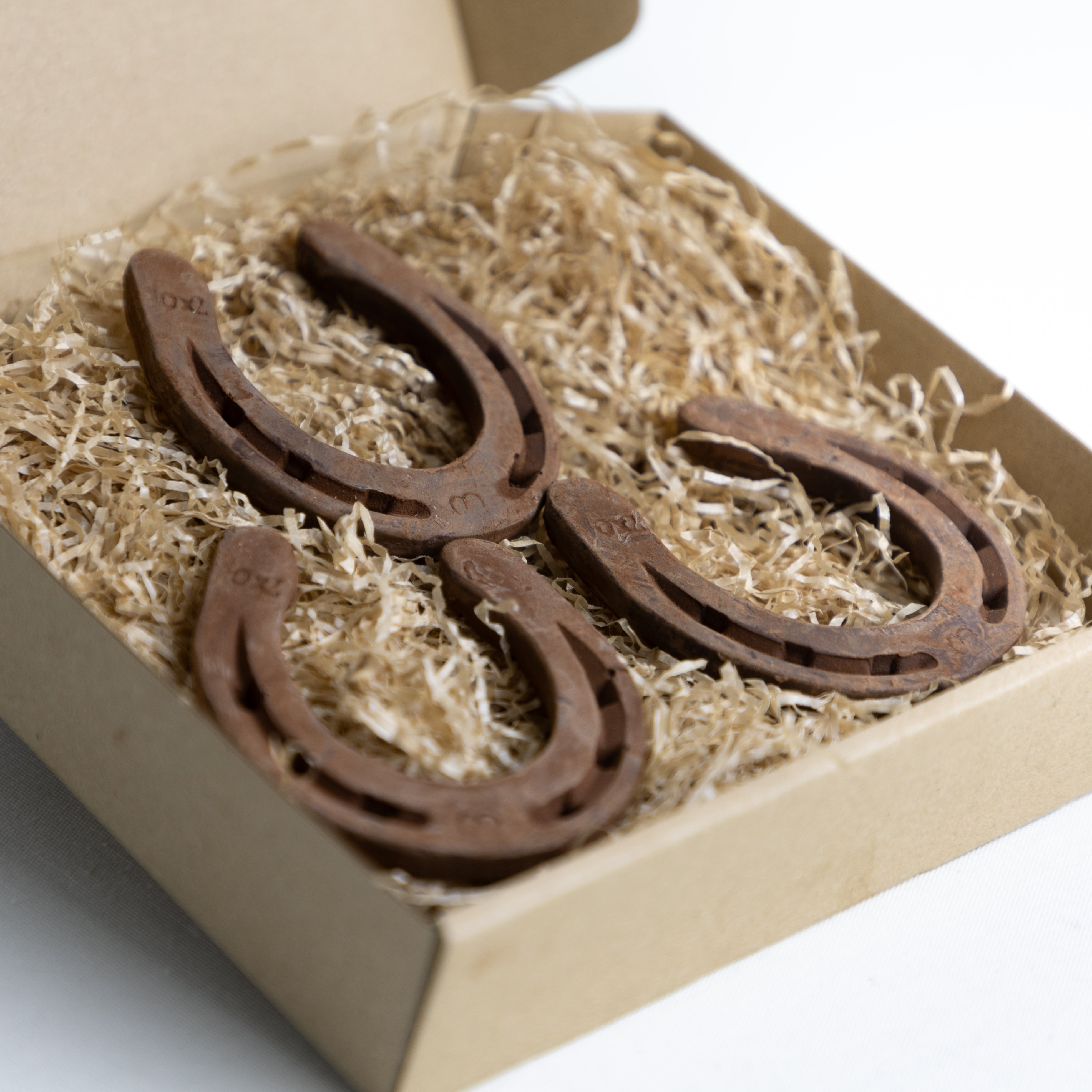 Verklighetstrogna hästskor i choklad. Överdragen med kakaopulver för att få den rätta känslan av rost.