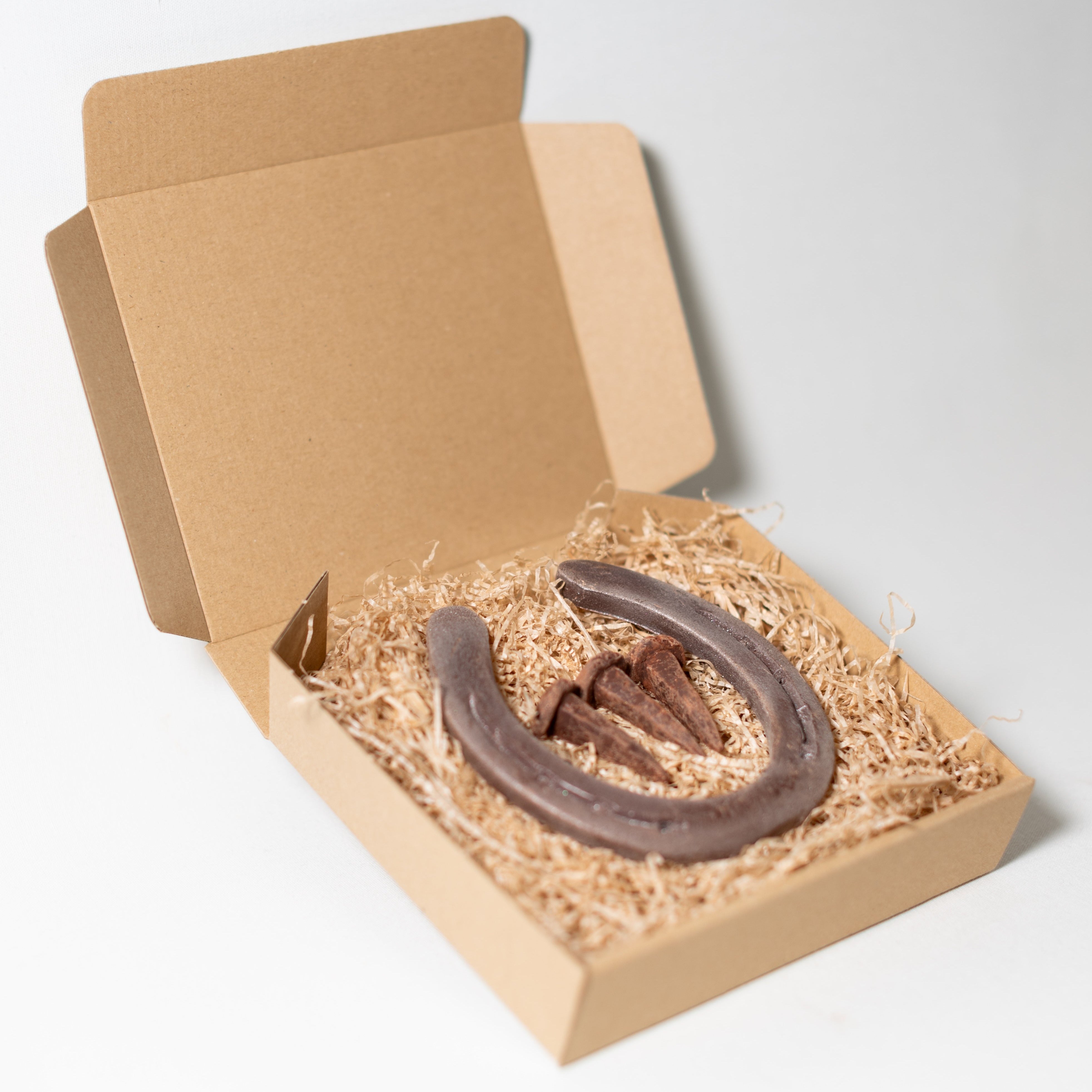 Verklighetstrogen hästsko i choklad. Överdragen med sockerlag för att få den rätta känslan av stål.