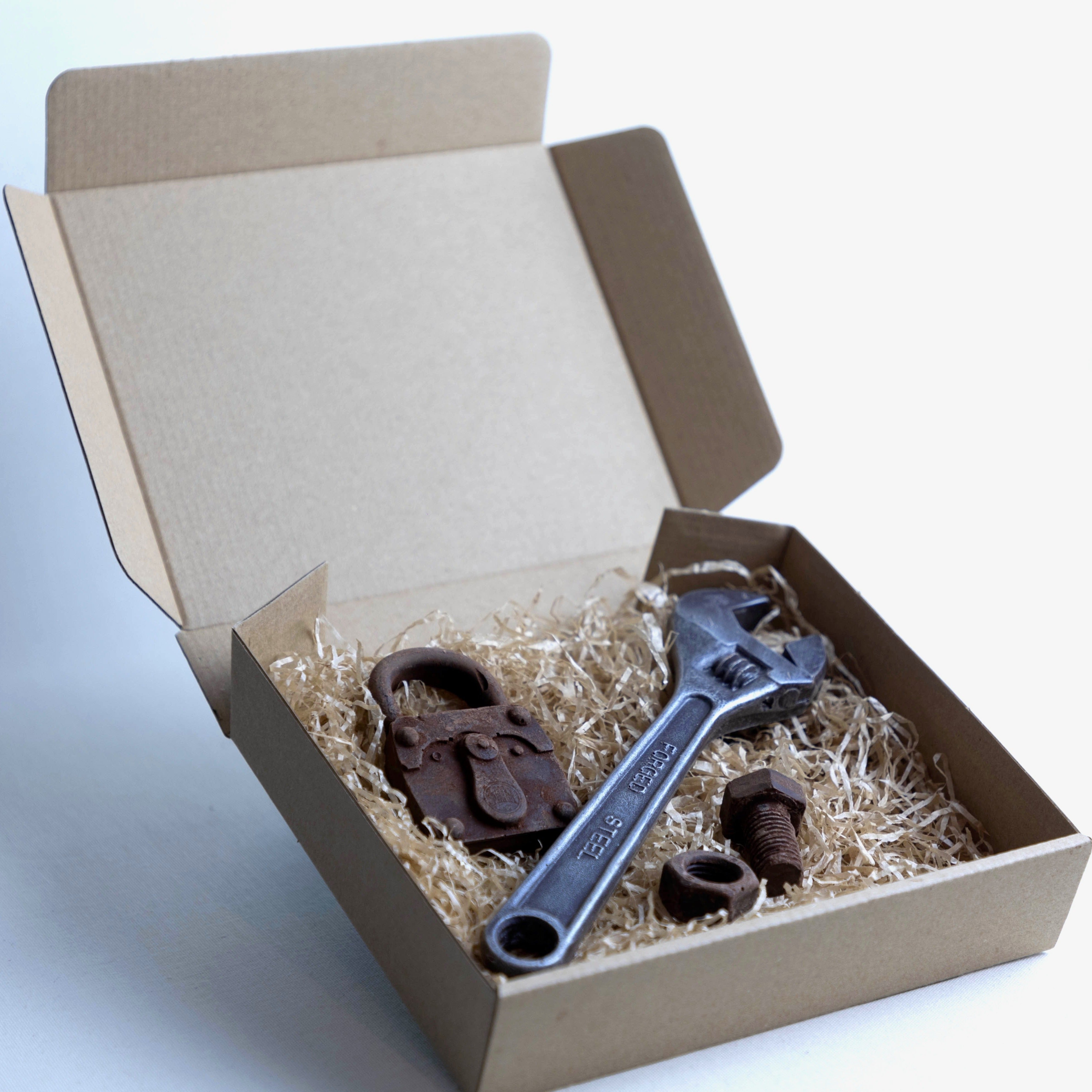 Verklighetstrogen skiftnyckel paket i choklad. Ett unikt hantverk som är en mycket uppskattad present till "gör det självaren", mekanikern, fixaren eller bara alla som gillar riktigt god choklad.