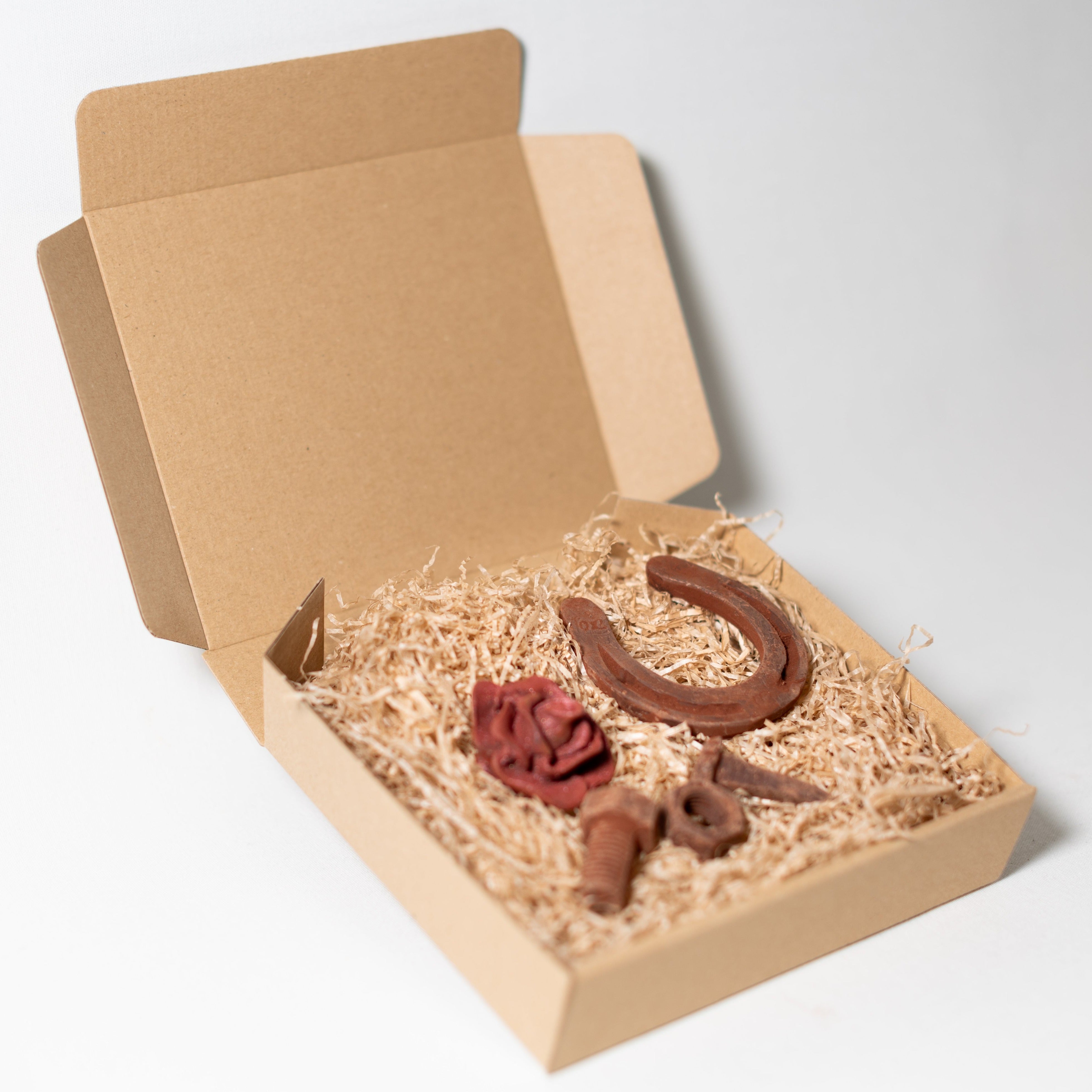 Verklighetstrogen hästsko tillsammans med en röd ros + en mutter, en bult & en spik i choklad. Överdragen med kakaopulver för att få den rätta känslan av rost.